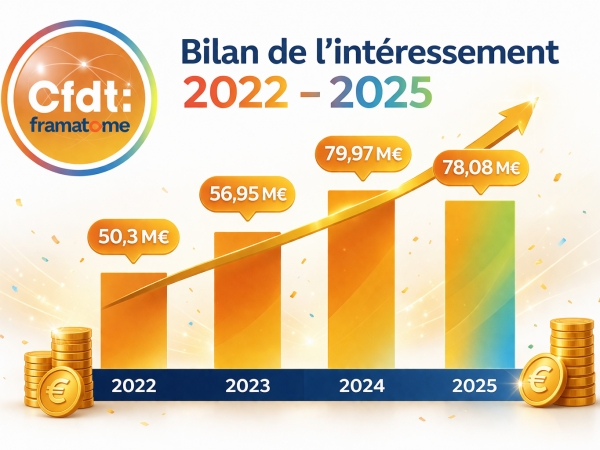 Bilan de l'intéressement 2022/2025 09-04-2026 En 2022, vous avez choisi la CFDT...Depuis 4 ans, la CFDT négocie, agit et obtient ! Découvrez le bilan de l’intéressement des 4 dernières années. Le bilan 2022/2055 Interessement Framatome