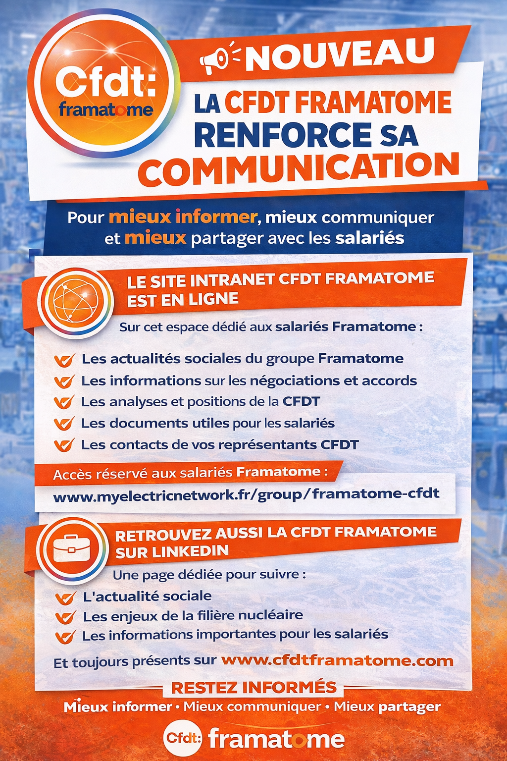 La CFDT Framatome met à votre disposition de nouveaux outils d’information pour suivre l’actualité sociale de l’entreprise et de la filière nucléaire.